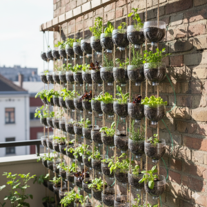 Fixando garrafas horizontalmente em uma parede ou estrutura de madeira, é possível criar uma horta vertical eficiente.